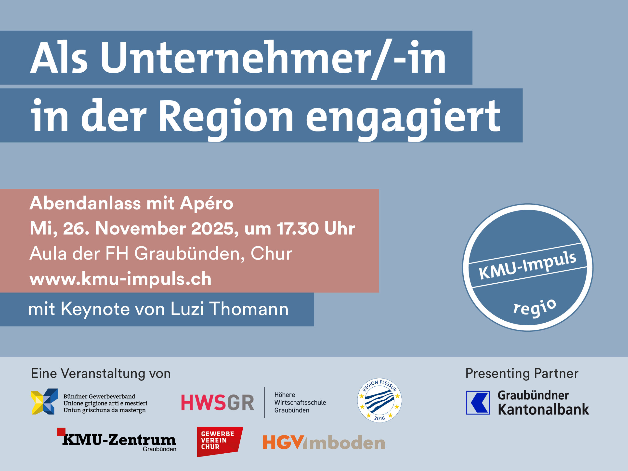 KMU-Impuls regional ist ein gemeinsames Angebot des Bündner Gewerbeverbands, der Höheren Wirtschaftsschule Graubünden und der Region Plessur. Der Anlass in Chur findet in der Aula der FH Graubünden statt. Im Anschluss findet ein Netzwerkapéro statt. Der Anlass ist öffentlich und kostenlos und richtet sich an Unternehmerinnen und Unternehmer, Führungspersonen sowie weitere Personen, welche sich für das soziale und gesellschaftliche Engagement interessieren.